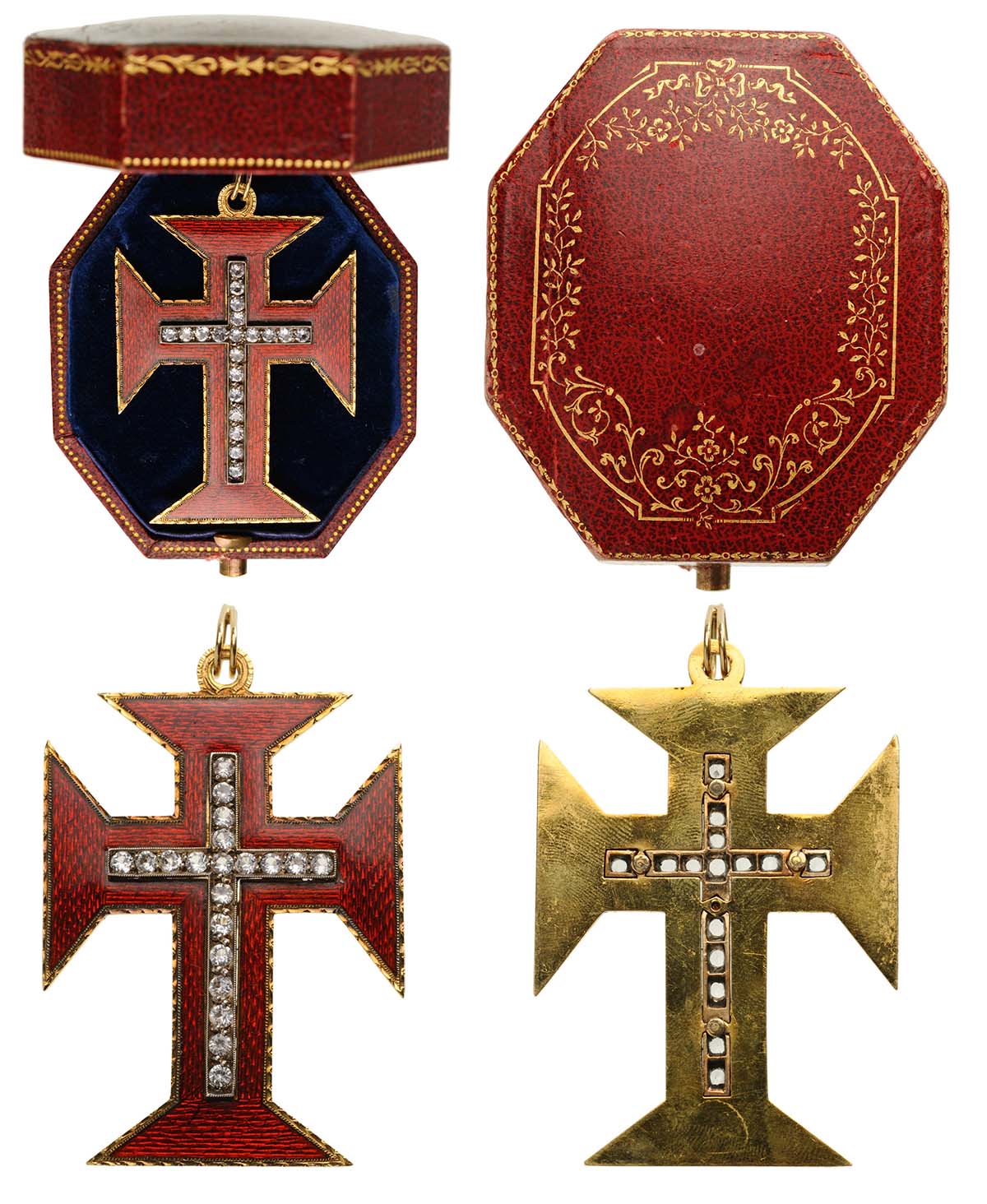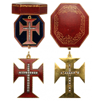 Jewelled Badge of the Order from the 2nd half of 19th Century, 59x41 mm, red enameled, chiseled GOLD cross, applied centre cross in silver, completely set with brilliant-cut white stones, plain, polished reverse, round suspension loop and small, doubled ringlet, in a red, fitted case. A very interesting, rare piece of excellent manufacture, extremely fine condition. I R!