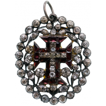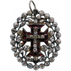 Jewelled badge of reduced size, 32x27 mm, the Order’s cross set with red stones, within an elaborate pattern of foliage and round border, profusely set with diamonds, upper loop and original suspension ring.
