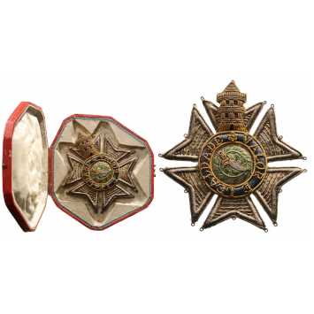 An early, embroidered Breast Star of the 1st Type (awarded in the period 1808-1834), 82x80 mm., with elaborate work of silver and gold broderies, paillettes and coloured thread, the arms’ tips, with tiny loops to fasten the star to the habit, the reverse, with ivory paper, in the original, fitted case of issue.