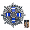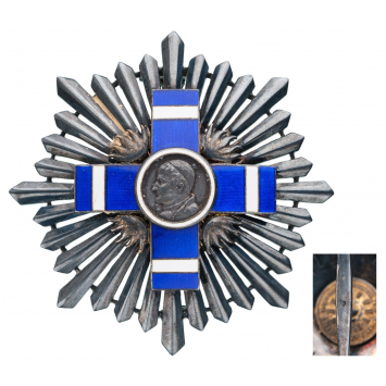 1st Class Breast Star, instituted in 1946. Breast Star, 69 mm., Silver, hallmarked "800", maker's mark, superimposed parts enameled, original medium pin on reverse. Very interesting and attractive star, of high appearance and extremely fine condition and scarce! I R!
