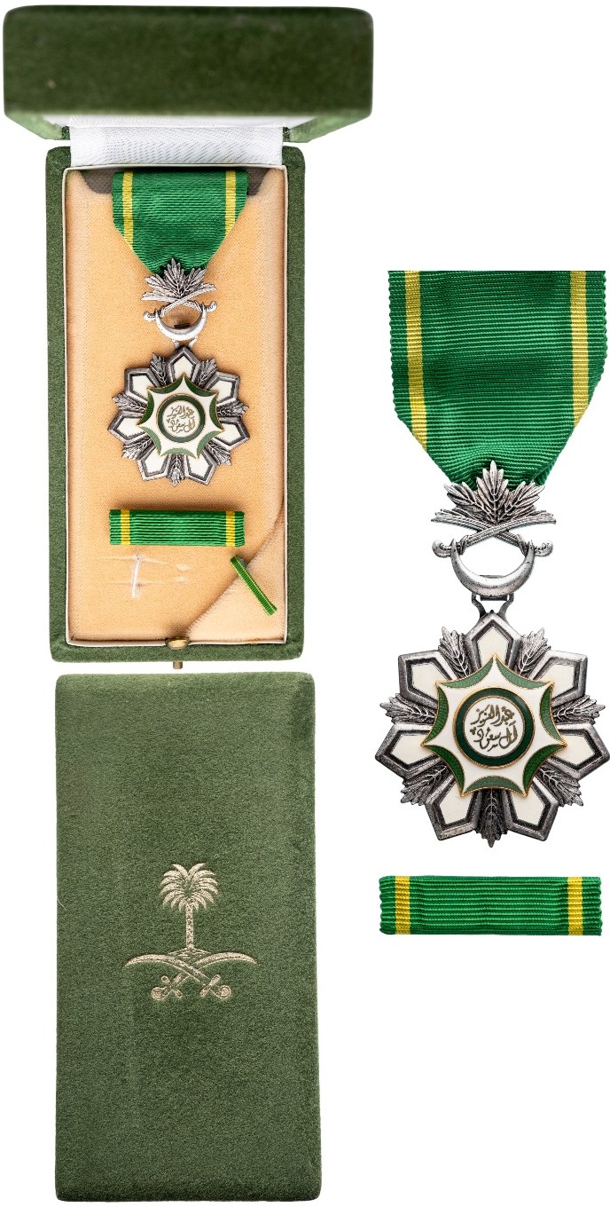 Knight's Cross, instituted in 1964. Breast Badge, 66x40 mm, Silver, one-side enameled, original suspension palms, ring and ribbon, in case of issue with gilt weapon on the lid, together with lapel bar. A beautiful rare badge, awarded to an British Official, in mint condition! I R!