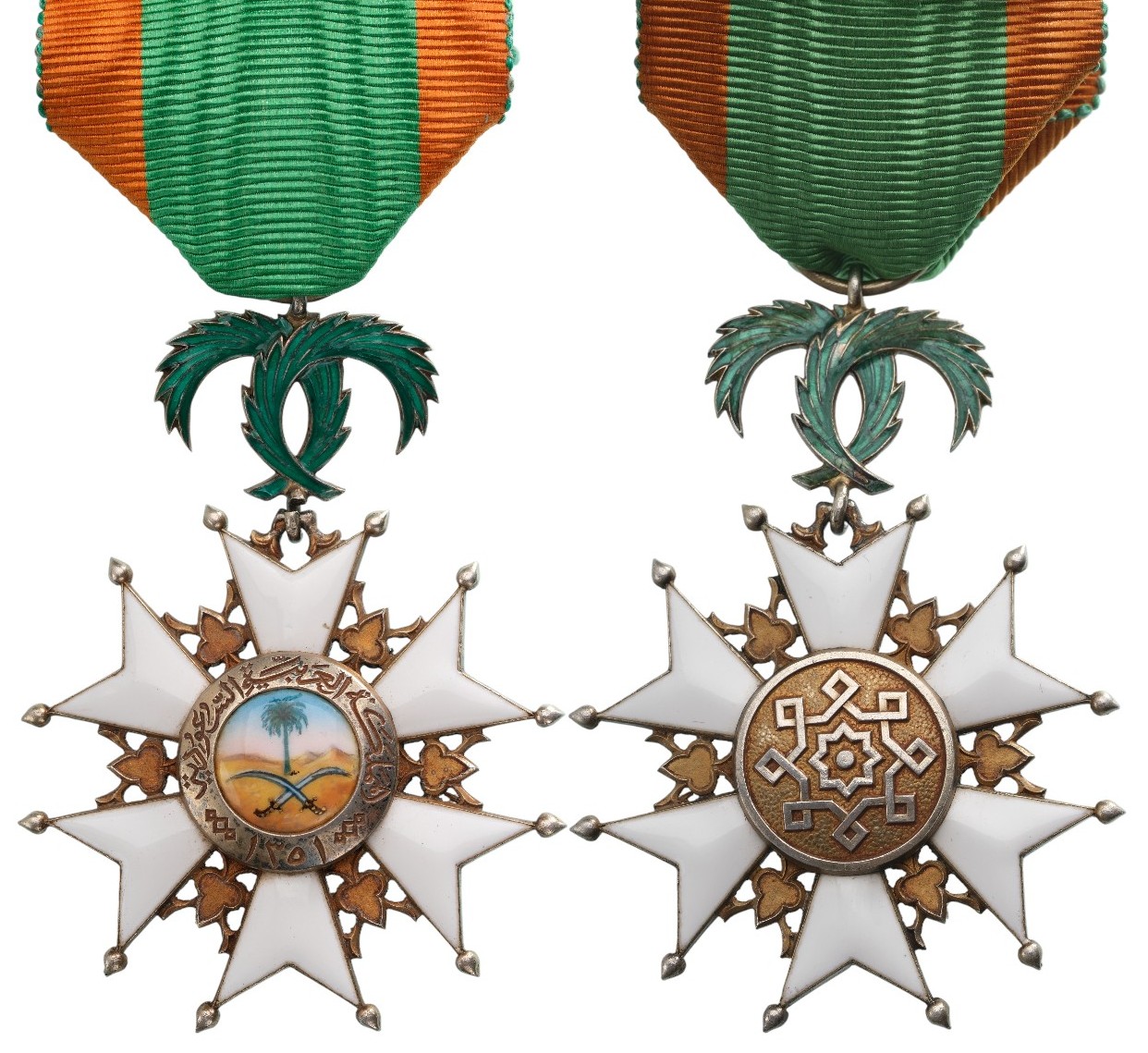 Knight's Cross, instituted in 1971. Breast Badge, 60x41 mm, gilt Silver, both sides enameled, original suspension palms, ring and ribbon. A beautiful rare badge, in extremely fine condition! I- R!