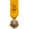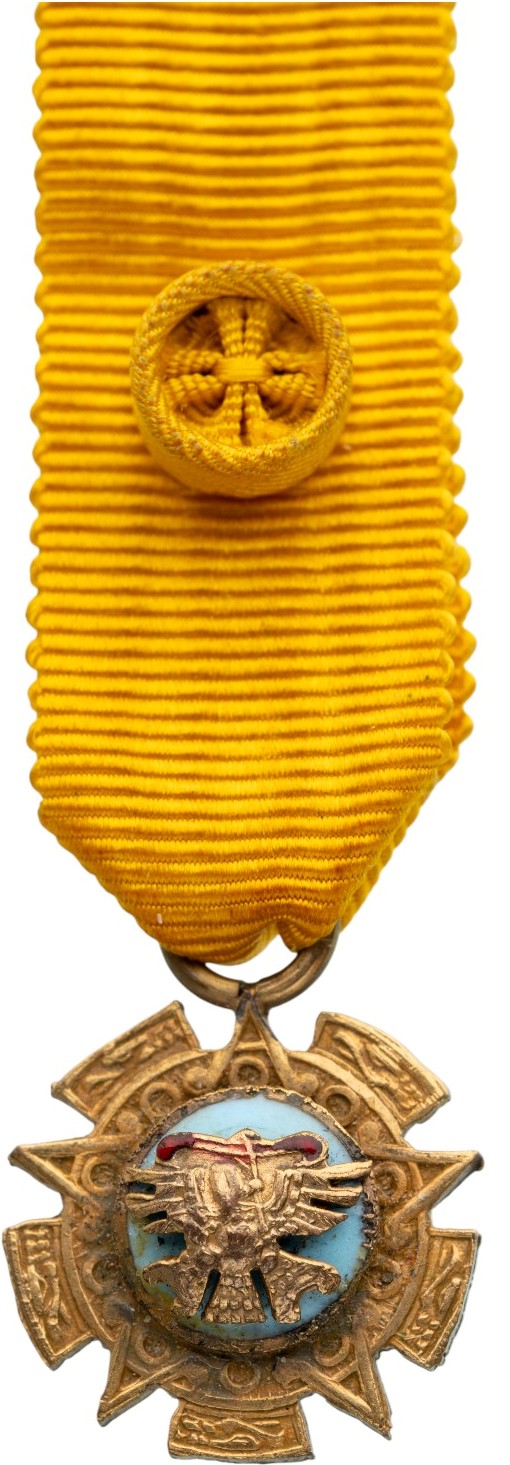 Officer's Cross Miniature, 4th Class, instituted in 1933. Breast Badge, 15 mm., gilt Bronze, original suspension ring and ribbon with rosette. An attractive miniature, in mint condition! I