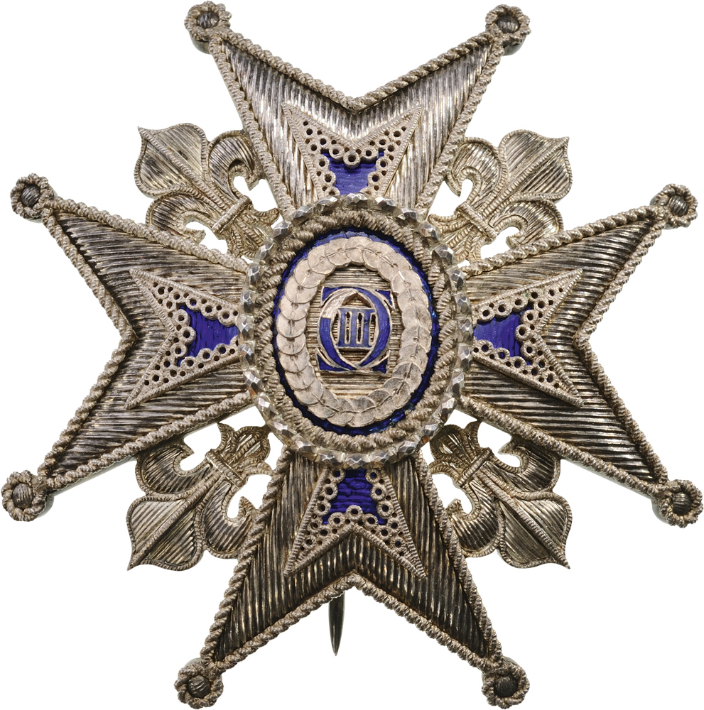 Numerary Commander’s Star. Breast Star, 59x57 mm., Silver cross flanked by fleurs-de-lys, engraved and chiselled imitating the embroidery, the arms with blue enameled details, oval centre medallion with the blue enameled monogram “C” within an oval of chiselled silver “sequines”, diamond-cut chiselled silver outer circlet, the reverse with convex counter-medallion, vertical, round pin. An attractive, curious and rare star of slightly reduced size, from the late 19th Century, extremely fine condition. I R!
