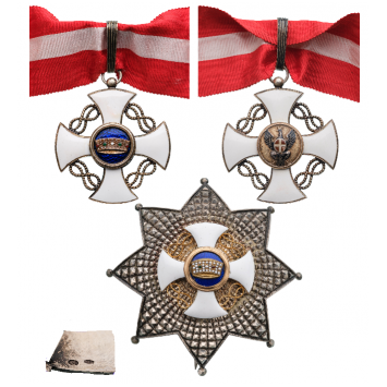 Grand Officer's Set, instituted in 1861. Neck Badge, 60x55 mm, Silver, both sides enameled, original suspension ring, loop and ribbon. Breast Star, 75 mm., Gold and Silver, superimposed part enameled and gilt, thin pin on reverse. Superb set, in mint condition! I