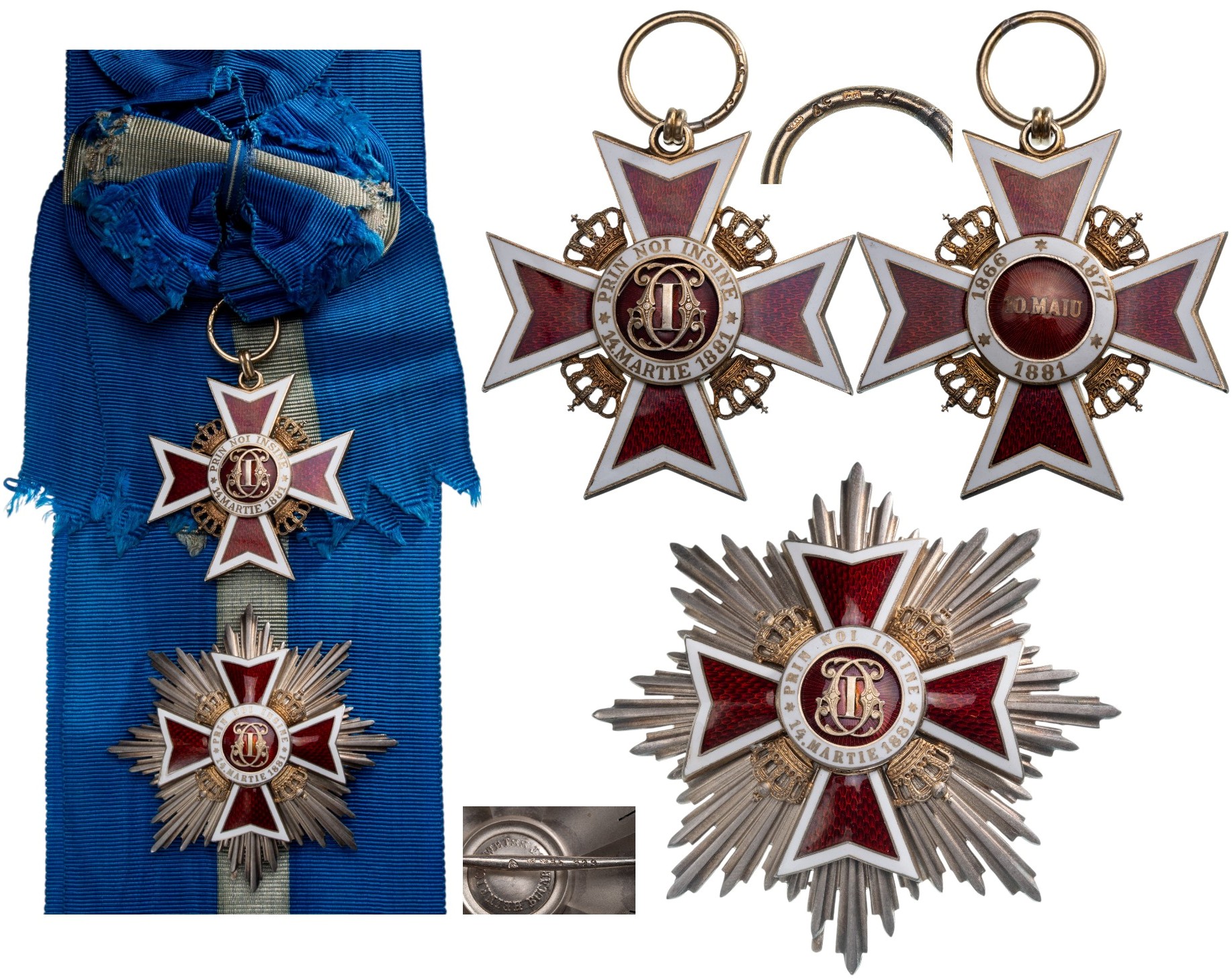 Grand Cross Set, 2nd Model, Civil. Sash Badge, 57x55 mm, Silver gilt, hallmarked "79 - HW - 37- crown", both sides red enameled, with long original sash. Breast Star, 76 mm, Silver, hallmarked "34 - 329 - crown - RS - 935" maker`s mark "HEINRICH WEISS, BUCAREST", enameled, long thin pin back. A superb set, in perfect condition! I