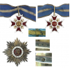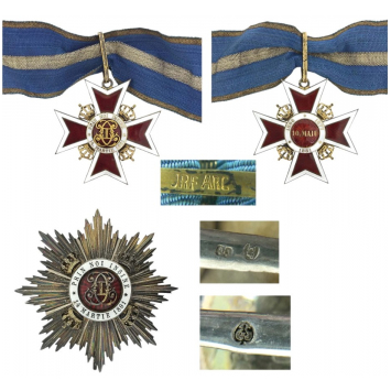 Grand Officer's Set, Intermediary Model (1932) for Civil. Neck Badge, gilt Silver, 67 mm, hallmarked "ARG", maker`s mark "JRf (Joseph Resch Fils - Bucarest)", both sides enameled, original suspension loop and ribbon; obverse medallion with cipher of Carol I, reverse with "10 Maiu". Breast Star, Silver, 82 mm, French hallmarked "AA", maker`s mark "Kf (Kretly Freres) - JRF" (Joseph Resch Fils - Bucarest), partially gilt and enamelled, brilliant cut, reverse medium pin.