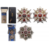 Grand Cross Set, 1st Type, MIlitary. Sash Badge, 80 mm, gilt Silver, enameled, original suspension ring and long sash. Breast Star, 85 mm, Silver, enameled with pin and two side hooks on reverse, in original case of issue by "Joseph Resch, Bucarest", with monogram of Kinf Carol I on the lid. A very rare set of French fabrication, of the highest jeweler's quality and in extremely fine condition! RR! I