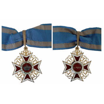 SKU: 1189 The Live Auction begins in: Click here to register for the live Auction Starting price 250 EUR Log in to place a bid. Total bids: 0ROMANIACommander's Cross 1st Type, Civil. Neck Badge, 69x56 mm., gilt Bronze, both sides enameled, original suspension loop and ribbon. A superb French luxury manufacture, in extremely fine condition! I Shop ID: 95Auction LXX - Day 2