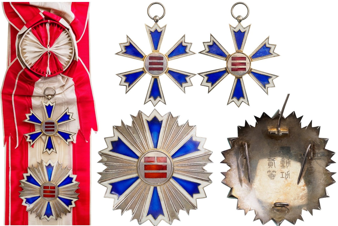 Grand Cross Set, 1st Class, instituted in 1901, obsolete in 1910. Sash Badge, 81x74 mm., Silver, both sides enameled, original suspension ring and long complete sash. Breast Star, 85 mm., Silver, superimposed parts enameled, with plain rays, the reverse with Korean inscription, broad pin and two side hooks. A superb and extremely rare set, awarded for less the 10 years, in mint condition ! I RR!