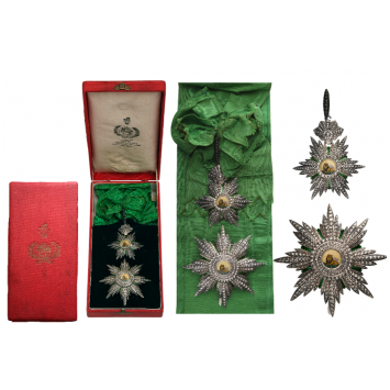 Grand Cross Set, 1st Class. Sash Badge, 75 x 69 mm., chiseled Silver star, composed of five major rays flanked by shorter ones, centre medallion with excellent enamel miniature of the Lion, on yellow background with beaming, rising sun, around, chiseled, round border, the upper ray with device and loop, linked to the ribbon ring, with diamond-cut chiseled details; with original, silk sash. Breast Star, 95 mm., Silver, hallmarked "swan", diamond-cut chiselled and pierced rays, flanked by green enameled short ones, centre medallion with excellently- made miniature painting, depicting the couching lion on the background of sun, the rays, under the translucent, yellow enamel, with a beautiful effect of reflexes, tapering pin and two side hooks, in case of issue by "Saniolmamalek - Teheran" with gilt weapon and class on the lid.