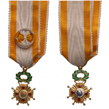 Officer`s Cross Miniature, 4th Class, instituted in 1815. Breast Badge, 17x10 mm, GOLD, 1.6 g., superimposed parts enameled, both central medallions Gold, enameled, original suspension wreath, ring and ribbon with rosette. A superb and beautiful miniature, in mint state! I