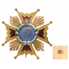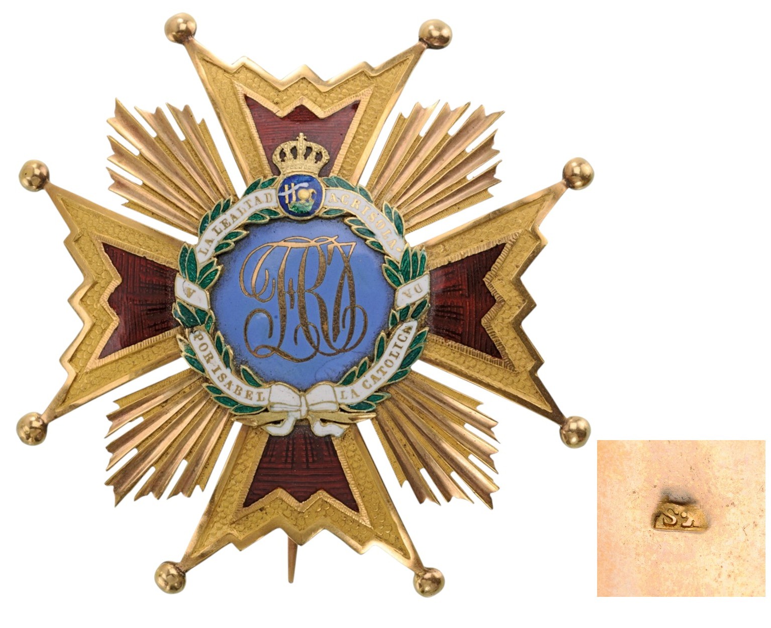 Commander’s Breast Star of slightly reduced size, 84x81 mm., GOLD, with red enameled details to the arms, flanked by polished beams, sky-blue enameled centre medallion, bearing the golden, elaborate Royal monogram, within green enameled laurel wreath around, tied by white enameled riband, bearing the golden inscription “A LA LEALTAD ACRISOLADA” and “POR ISABEL LA CATOLICA”, crowned, blue enameled tiny medallion, bearing the two pillars and the double orb, the reverse fitted with vertical pin of flattened section and struck with the maker’s mark “K.S.”. A beautiful, rare, early star from the mid 19th Century, excellent quality and condition. I R!