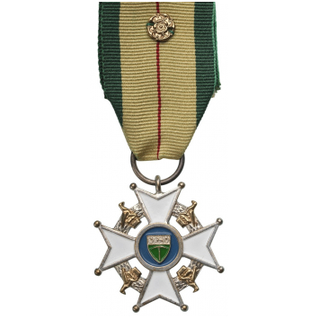 Knight's Cross Military (MLM), 5th Class. Breast Badge, 39x36 mm, Silver, white enameled cross, obverse centre medallion blue enameled, round suspension ring and original ribbon with gilt Silver rosette. A rare and beautifully made piece, in mint condition! I R!