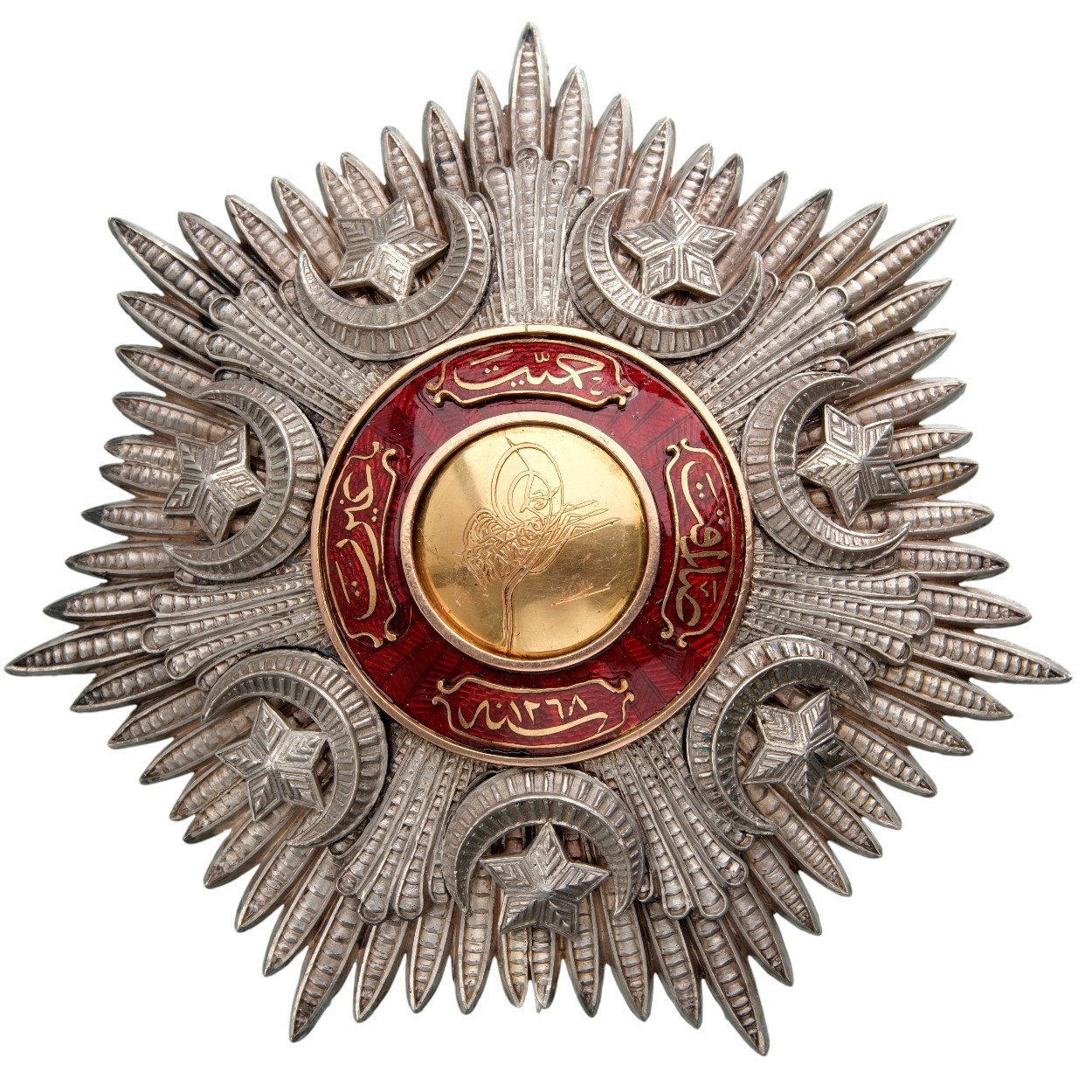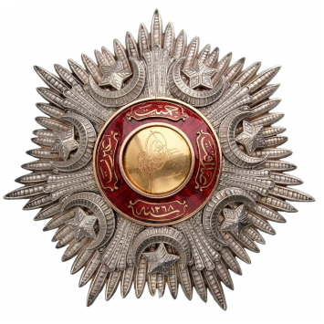 Grand Cross Star, 1st Class, Crimean Period. Breast Star, 107 mm., Silver, in chiseled and pierced silver with gold centre medallion with the Sultan`s Tughra, with red enameled details and applied scrolls with inscriptions, the reverse with concave counter-medallion, broad pin and fixation rings on each point. A superb and very rare old star of the Crimea period, in extremely fine condition. I RR!