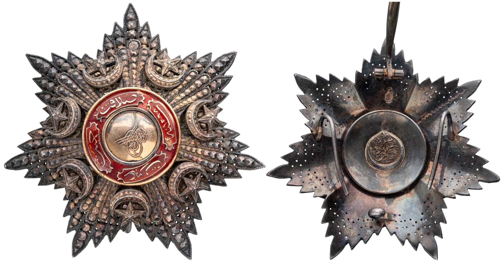 Grand Officer's Star, 2nd Class, Crimean Period. Breast Star, 85 mm., Silver, Turkish hallmarked, in chiseled and pierced silver with gold centre medallion also with the Sultan`s Tughra, with red enameled details and applied scrolls with inscriptions, the reverse with concave counter-medallion bearing the escutcheon of the Turkish Imperial Mint, broad pin and two hooks. A superb and very rare old star of the Crimea period, in extremely fine condition. I R!