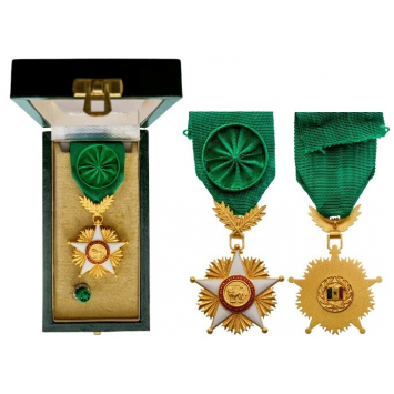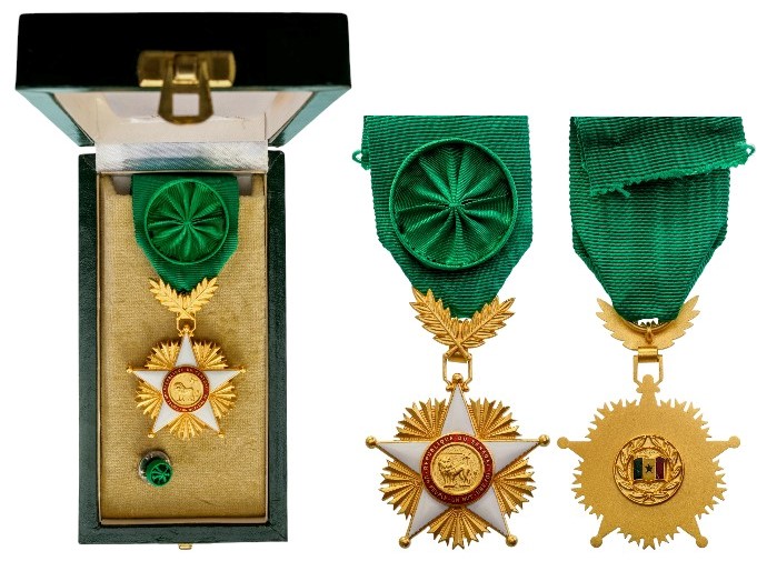 Officer’s Cross, 4th Class, instituted in 1960. Breast Badge, 55x42 mm, gilt Silver, original suspension ring and ribbon with rosette, in case of issue by “Comptoir France – Suisse, Dakar”.