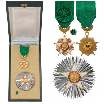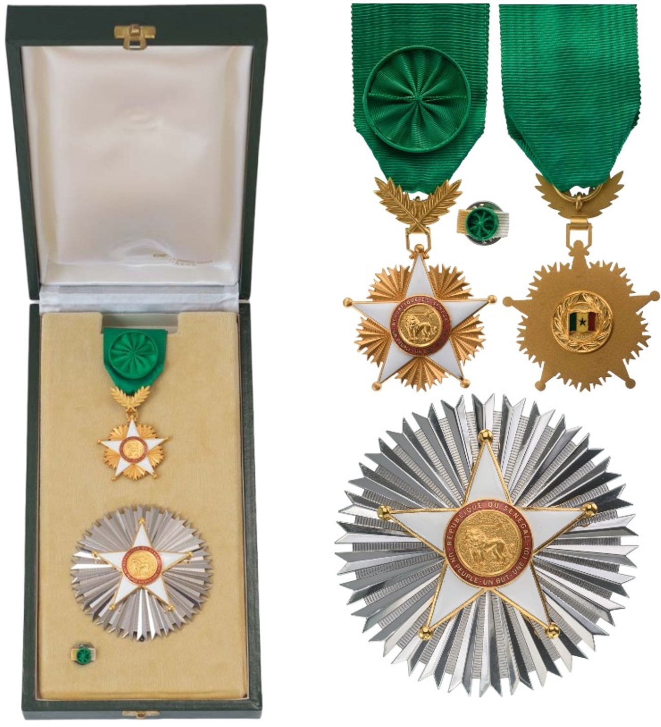 Grand Officer's Set, 2nd Class, instituted in 1960. Breast Badge, 63x42 mm, gilt Bronze, both-sides enameled, central medallion gilt silver, original suspension ring and ribbon with rosette. Breast Star, 81 mm, sivered Bronze, superimposed part gilt silver, enameled, reverse with long vertical pin, in case of issue by "Comptoir-Franco Suisse - Dakar", together with lapel hole rosette. A superb set, in mint state! I