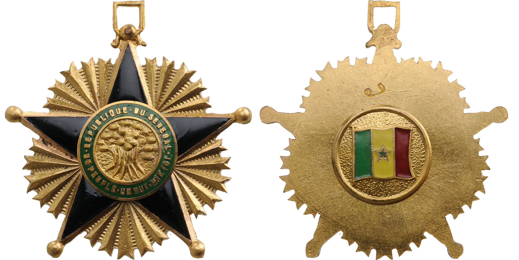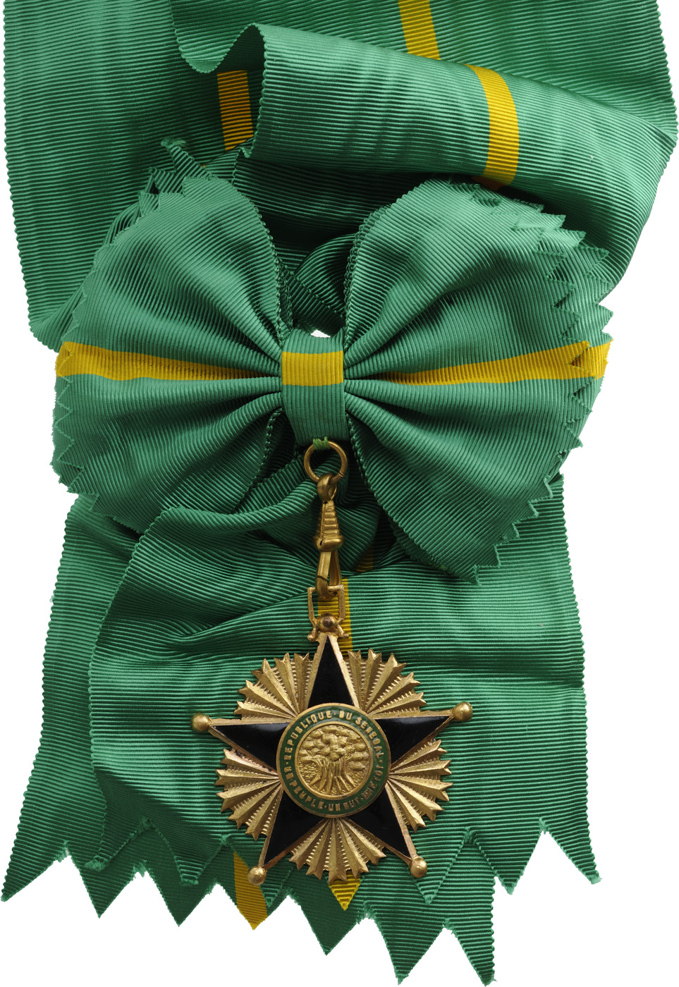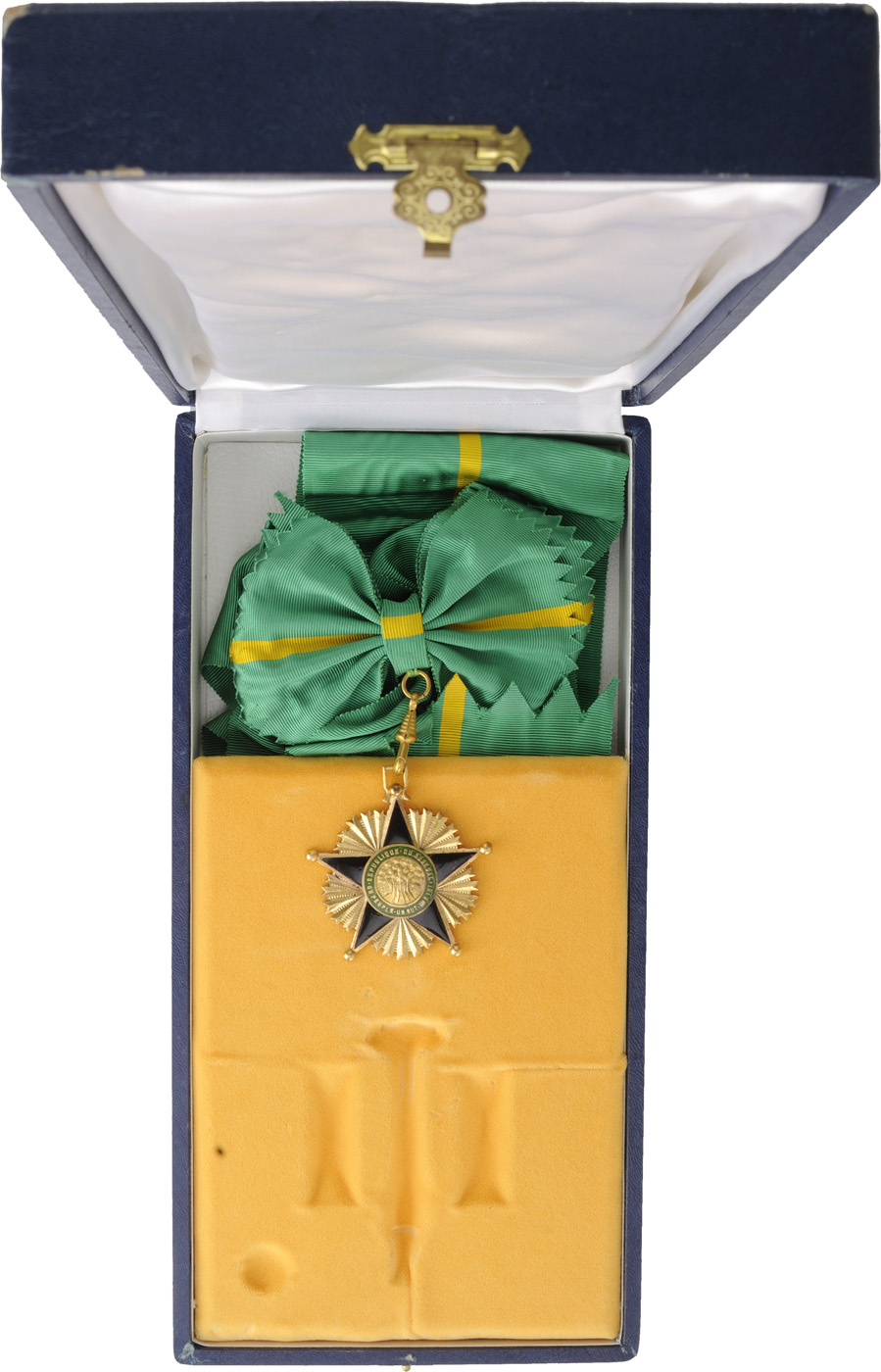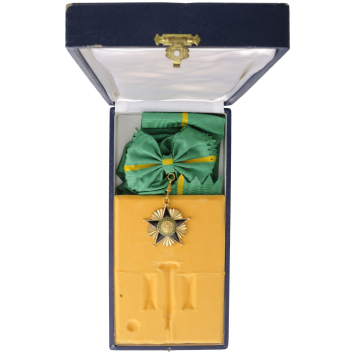 Grand Cross Badge, instituted in 1960. Sash Badge, 63x58 mm, gilt Bronze, both sides enameled, original suspension device and long complete sash, in case of issue. A rare badge in perfect condition! I R!