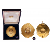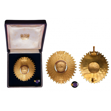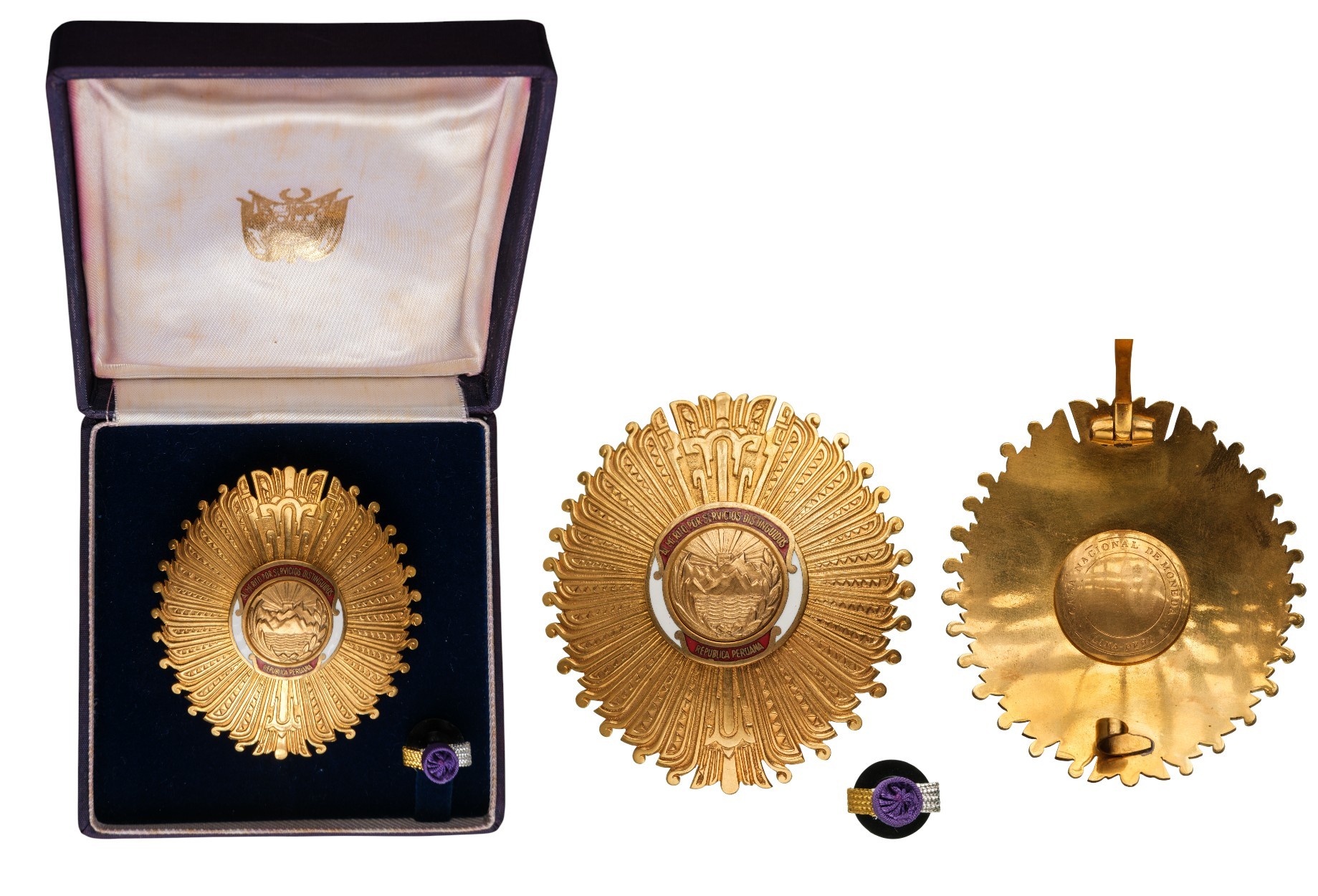 Grand Officer Star, instituted in 1950. Breast Star, 79x73 mm., gilt Bronze, makers' mark "Casa Nacional de Moneda - Lima", center parts enameled, medium pin on reverse, in case of issue with gilt weapon on the inner cushion and lapel hole rosette for Grand Officer. A scarce order, in mint condition! I R!