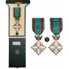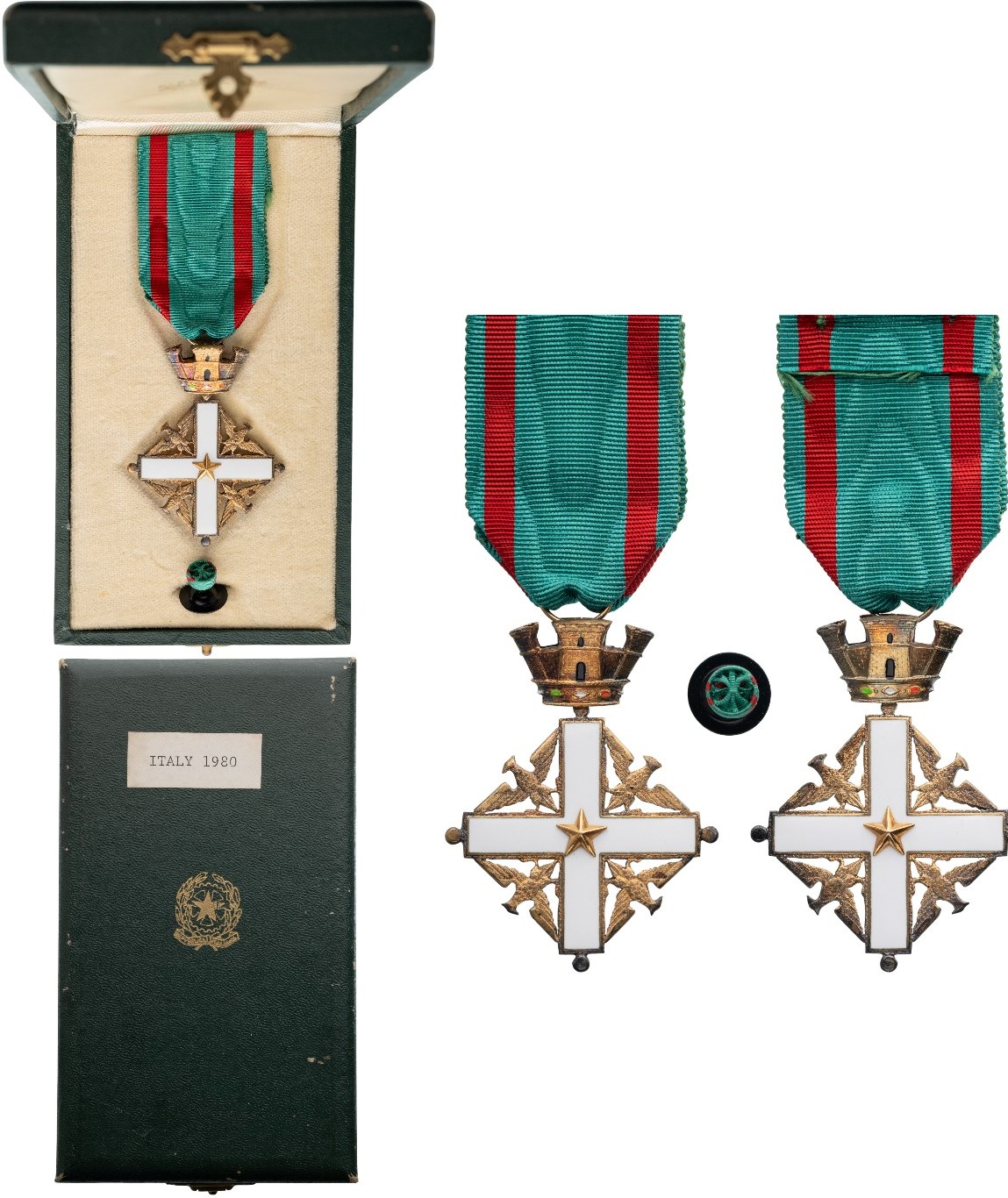 Knight's Cross, instituted in 1951. Breast Badge, 59x45 mm., gilt Silver, one-side enameled, original suspension ring and ribbon, in case of issue by "Cravanzolla - Roma" and gilt weapon on the lid, with lapel hole rosette. A beautiful cross, awarded to an British Official, in mint condition! I