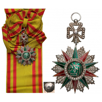 SKU: 1564 The Live Auction begins in: Click here to register for the live Auction Starting price 300 EUR Log in to place a bid. Total bids: 0TUNISIAGrand Cross Badge, 1st Class, Sidi Ahmed (1929 - 1942). Sash Badge, 94x61 mm, Silver, partially enameled, original suspension ring, loop and sash. Extremely fine condition. I . Shop ID: 69.86Auction LXX - Day 2