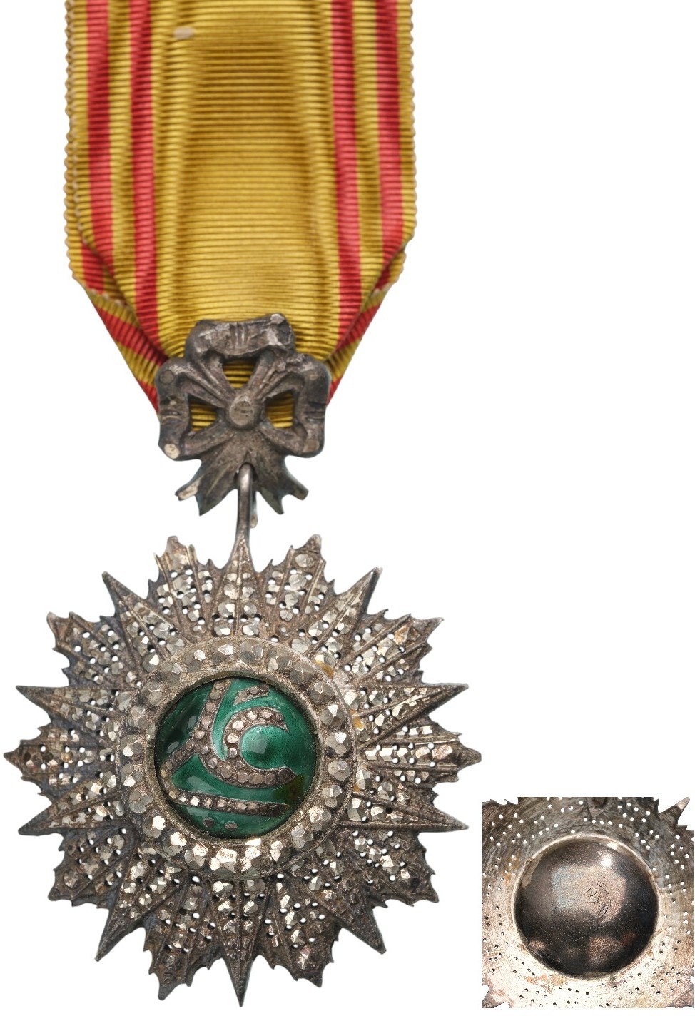 SKU: 1574 The Live Auction begins in: Click here to register for the live Auction Starting price 50 EUR Log in to place a bid. Total bids: 0TUNISIAKnight's Cross, 5th Class, Ali Bey (1882 - 1902). Breast Badge, 71x49 mm, Silver, partially enameled, original suspension ring and ribbon. Extremely fine condition. I . Shop ID: 69.59Auction LXX - Day 2