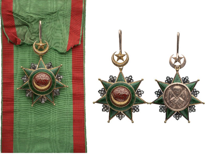 1st Class Badge with Diamonds, instituted in 1862. Sash Badge, 79x61mm., GOLD, green enameled, the enameled rays, alternated with diamond-set ones, red enameled centre medallion with Arabic inscription: “Abdülaziz Khan, Sovereign of the Ottoman State, who relies on Divine Guidance”, green enameled reverse with centre medallion in gold depicting drums and flags, above, an oval with the date “699” (1299/1300), GOLD Crescent and Star suspension and grooved ribbon ring, original, unsewn sash ribbon.