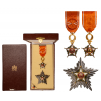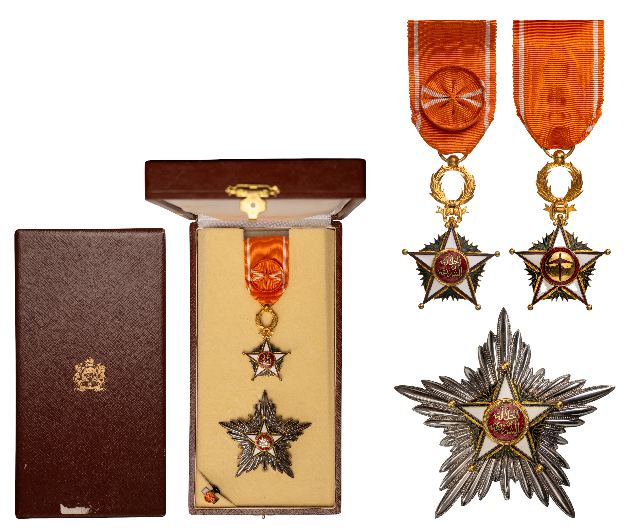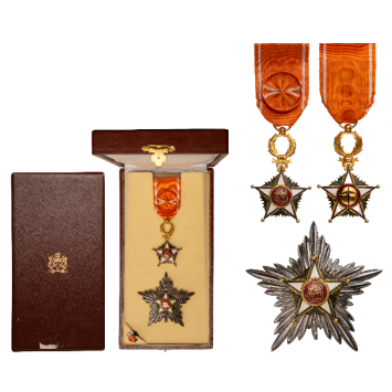 Grand Officer's Set, instituted in 1913. Breast Badge, 40 mm, gilt Bronze, enameled, original suspension wreath and ribbonwith rosette, Breast Badge, 78 mm, silvered metal, central medalion enameled, gilt, with vertical pin on the back. In case of issue by "Arthus Bertrand, Paris" with gilt coat of arms on the lid, together with lapel hole rosette. I