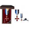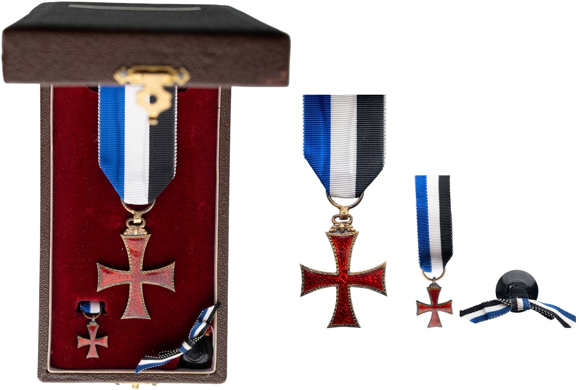 Knight's Cross, 5th Class, instituted in 1960. Breast Badge, 44x32 mm., gilt Bronze, one-side enameled, original suspension ring and ribbon, in case of issue by "Frederico Costa - Lisboa" with miniature and lapel bar. A beautiful cross, awarded to an British Official, in mint condition! I