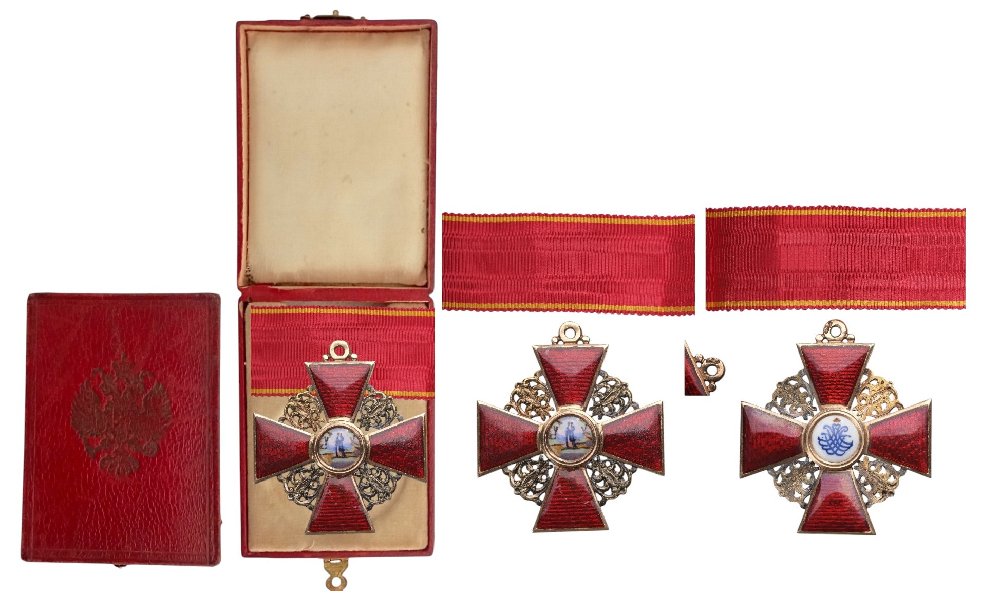 Commander's Cross, 2nd Class, instituted in 1735. Neck Badge, 48x43 mm., GOLD, hallmarked "56, eagle", maker's mark "A.K. - Keibel", enameled, original suspension ring and ribbon, in case of issue, with gilt double eagle on the lid. A beautiful cross, in mint condition. I