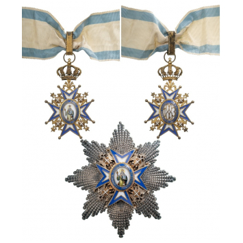 Grand Officer’s Set, 2nd Class, 3rd Model, instituted in 1883. Neck Badge, 85x52 mm, gilt Silver, both-sides enameled, central medallion gilt silver, original suspension ring, loop and ribbon. Breast Star, 78 mm, Silver, superimposed part gilt silver, enameled, reverse with long vertical pin.