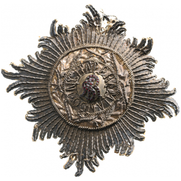 Grand Cross Star in Cloth, 120 mm, 8-pointed star with straight rays with a central medallion bearing the letters "SS" in red stones, surrounded by the Latin words "Praemiando incitat", which is in turn surrounded by a laurel wreath. Superb worn star from the period 1815-1830, of high rarity! II- RR!