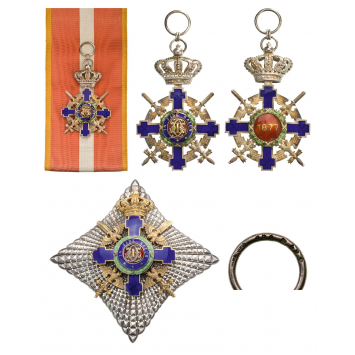 1st Class Set for Military (1938). Sash Badge with swords, 86x57 mm, Silver, both sides dark blue enameled obverse medallion with cipher of Carol I, reverse medallion with 1877, original crown and suspension ring, hallmarked "SILBER, 354 Mn 42, crown", maker`s mark "CFZ", original sash. Breast Star with swords, 90 mm, Silver, superimposed parts gilt and enameled, brilliant cut, multipart construction, reverse with medium pin back, hallmarked "SILBER, 545 Mn 41, crown", maker`s mark "CFZ". Extremely rare set and model awarded to only 25 recipients in 1938! I RR!