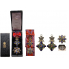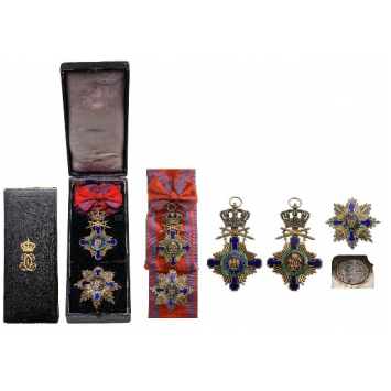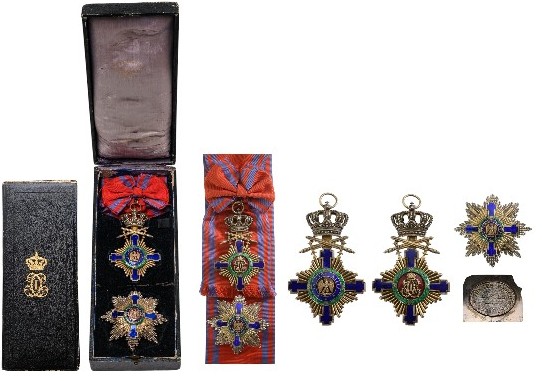 Grand Cross Set, 1st Model (1877), for Military in Time of Peace. Sash Badge, 115x76 mm, Silver gilt, both sides enameled, original suspension ring and long complete sash. Breast Star with Swords, 92 mm, Silver, superimposed part gilt and enameled, brilliant cut, maker`s mark "Joseph Resh Fils-Bucarest", long pin on reverse, in original luxury case of issue by "Joseph Resch Fii - Bucuresci", with gilt monogram of King Carol I on the lid. Very rare complete set, in superb condition! RR! I