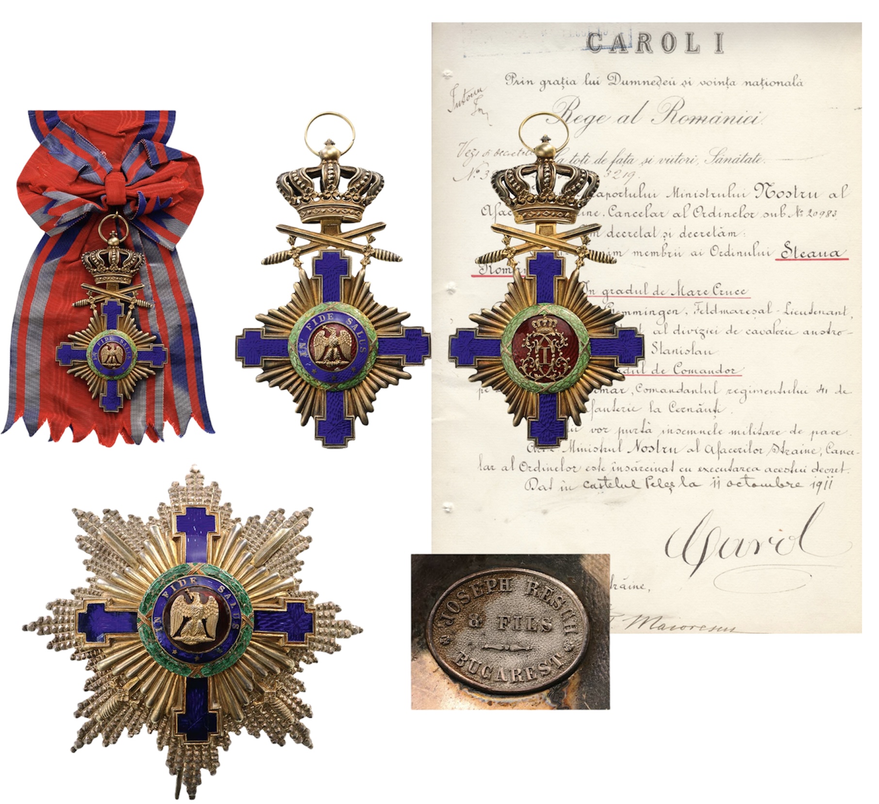 Grand Cross Set (1885), 1st Model, for Military in Time of Peace (swords under the crown). The order, instituted formally on 10th of May, 1877, was extended to the division "military in time of peace" in 1885, taking the form with swords under the crown, and for "military in war", with swords to the centre of the cross. Sash Badge in gilt Silver, maker`s mark "Resch", both sides dark blue enameled, obverse medallion with the eagle, reverse medallion with Carol I cipher. Original short sash in very good condition. Breast Star with swords, Silver, maker`s mark "Josef Resch&Fils, Bucarest", partially gilt and enameled, brilliant cut. Interesting set, very rare! Together with extremely rare awarding document dated 11th of October 1911,