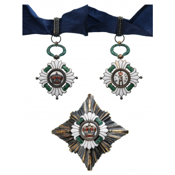 Grand Officer’s Set, 2nd Class, instituted in 1930. Neck Badge, 75x55 mm, gilt Silver, both-sides enameled (minor restoration on one ray), central medallion gilt silver, original suspension wreath, ring, loop and ribbon. Breast Star, 75 mm, Silver, superimposed part gilt silver, enameled, reverse with long vertical pin and two side hooks.