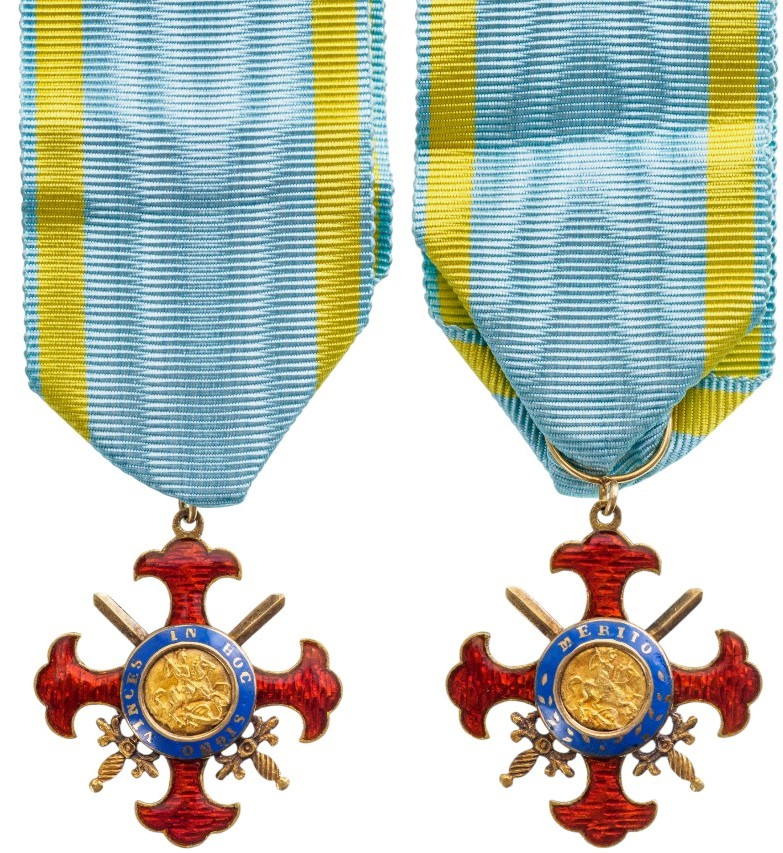 Knight's Cross, instituted in 1819. Breast Badge, 32 mm., GOLD, ruby-red enameled cross flanked by crossed swords; centre medallion bearing the golden image of St. George and the dragon, within gold bordered, blue enameled outer circlet bearing the inscription “IN HOC SIGNO VINCES”, reverse medallion as to the obverse, but the outer circlet bearing the motto “MERITO”, round suspension ring and long ribbon with original ribbon. A rare and elegant order, in excellent condition. I R!