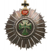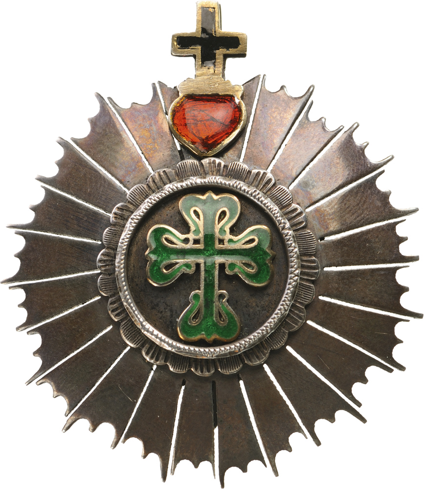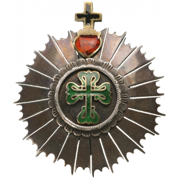 A first half of 19th century Breast Star of reduced size, 45x37 mm., smooth, grooved rays, Silver center medallion with the Order`s cross in green, translucent enamel, within a silver beaded and lobed outer circlet, the enameled sacred heart, made of yellow gold, surmounted by the cross, mounted to the stars upper ray, with a Biennais-type pin. A very early rare star, of the best jeweler’s quality in extremely fine condition! I RR!