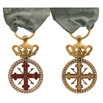 A Badge for Officials of the Order in Gold; the obverse as a red enameled cross of the Order with gold lettering, within round border of “diamond-cut” chiseled pattern with inner and outer, thin “roped” rim; the reverse with elaborate, finely done, engraved ornamentations; hinged crown of Royal type enriched with Bourbones’ fleurs de lys, large, round suspension ring and original, silk ribbon.
