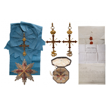 A complete set of Grand Cross of Justice the Order (also “Senator Grand Cross”): Sash Badge in Gold with narrow, red enameled pointed cross enriched by the golden Greek letters, forming the “Khi-Ro” monogram of Jesus Christ and the “Alpha” and “Omega” (the latter as a minuscule letter, determining the Parmese branch of the Order; the lower arm with beautiful appendant as a golden representation of St. George on horse and the dragon; the reverse, same as the cross’s obverse; on top, the Ducal crown with polished orb, round link-ring and grooved suspension ring, complete with its original, full-length sash ribbon; Breast Star of early, Austrian manufacture with typical, chiseled and pierced silver rays; the centre as the Order’s Cross in gold and translucent red enamel, in the original, black morocco, octagonal case with ivory velvet, fitted inner compart- ment; together, the original bestowal document signed by the Duchess of Parma Maria Ludovica (Marie Louise of Austria, widow of Napoleon I Emperor of the French), to Moritz Prince of Dietrich- stein, Baron of Hollenburg, Finkenstein and Thalberg, who was the personal pedagogue and insti- tutor of the Prince of Reichstadt, formerly the “Roi de Rome”, son of Napoleon and Marie Louise, then raised in Vienna, far from his own mother.