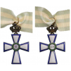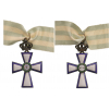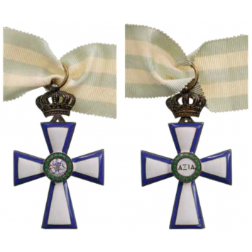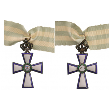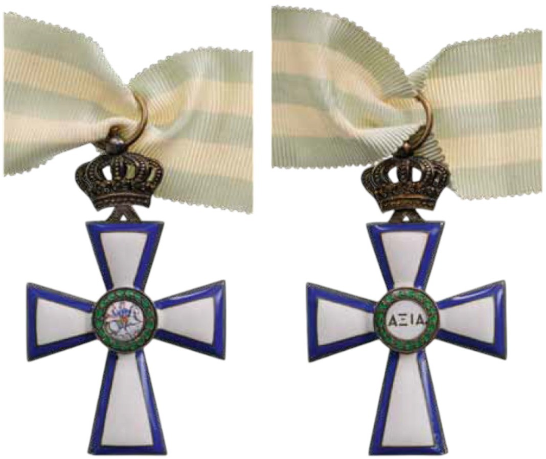 A Commander’s Cross of the 1913 type, in gilt Silver with convex white enamel and flat, dark blue border outlined in silver; obverse centre medallion with finest miniature-painted, enameled image of St. George killing the dragon within an outer circlet enriched by a laurel wreath with leaves of green, translucent enamel; the reverse medallion with Greek inscription also within a green enameled laurel wreath; hinged upper crown with circular suspension ring.