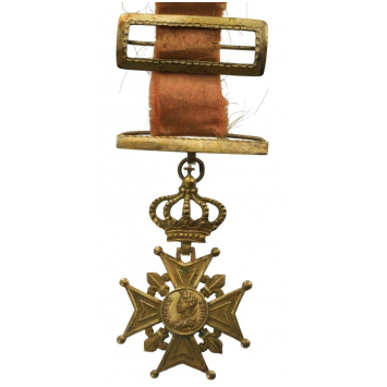 Fire-gilt uniface Silver cross of Maltese type with ball-finials, flanked by fleurs de lys; centre medallion with embossed portrait of the sovereign and around, the inscription “D. MIGUEL PRIMEIRO”; on top, Royal crown with chiseled details, round ring and suspension bar; original, red silk ribbon with rectangular, golden buckle with chiseled inner border.