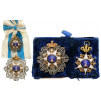 A complete set of insignia: Gold Badge made as a six-pointed, white enameled star with chiseled border, flanked by fleurs de lys; blue enameled centre medallion with enameled image of the Queen of Spain with Royal attributes, within blue enameled outer circlet with golden inscription “LA REINA A SUS CAPELLANES DE HONOR”; blue enameled reverse centre medallion with golden monogram; royal crown suspension and original, silk sash ribbon; Breast Star with chiseled, silver rays; the centre, made as the obverse of the badge, in gold and enamels; upper crown in gold with chiseled details and red enameled inner cap; the reverse, fitted with vertical pin and two side-hooks; both on the fitted blue velvet compartment, once belonging to the original case; the reverse, with handwritten inscription “Eugeni Aulet pbre. Olot” (probably the name of the ancient owner).