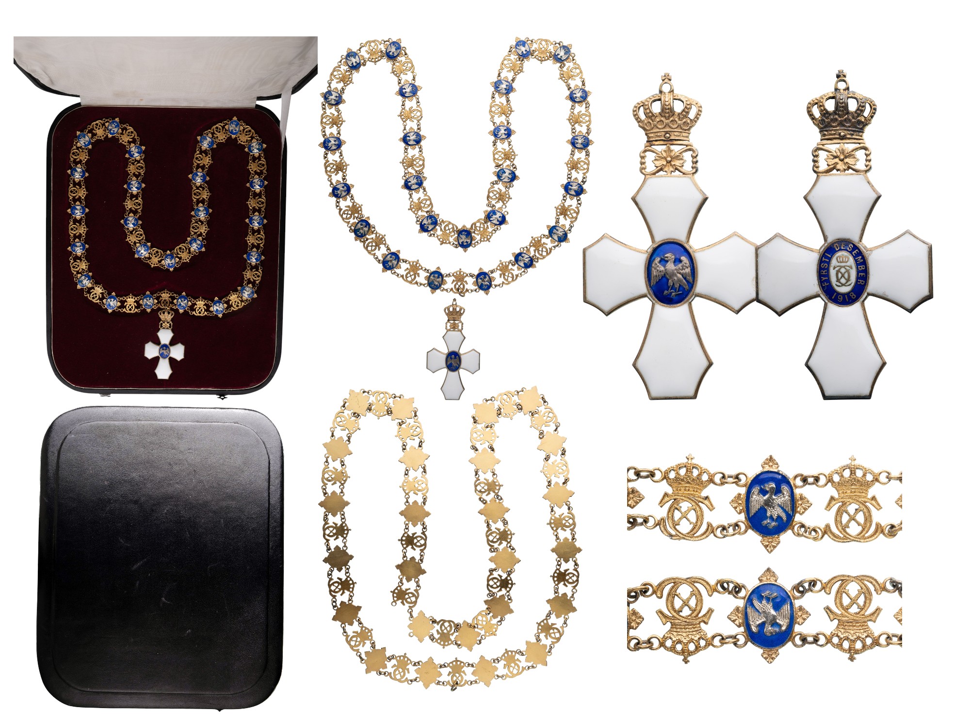 A Grand Collar Class of the Order, 1st type (1921-1944) in gilt Silver, composed of 25 crowned „CX“ Royal monograms of the Danish King Christian X and 25 blue enameled, oval medallions bearing the white enameled white sea falcon, all linked by small rings; to the centre falcon-link the Order‘s badge is appended as a white enameled cross with „cut“ corners to the arms; sea-blue enameled centre medallion bearing the embossed silver sea-falcon; oval, white enameled reverse centre medallion bearing the crowned monogram „CX“, within blue enameled outer circlet bearing the inscription „FYRSTI DESEMBER 1918“ (the date of the creation of the independent State of Iceland, under the Danish Crown); the cross‘s upper arm, with a stylized flower and branches linked to the Royal crown, its orb as the suspension loop; in its original, black leather presentation case, with wine-red velvet, fitted inner compartment and ivory, moirée silk, lid‘s inner cushion.