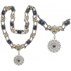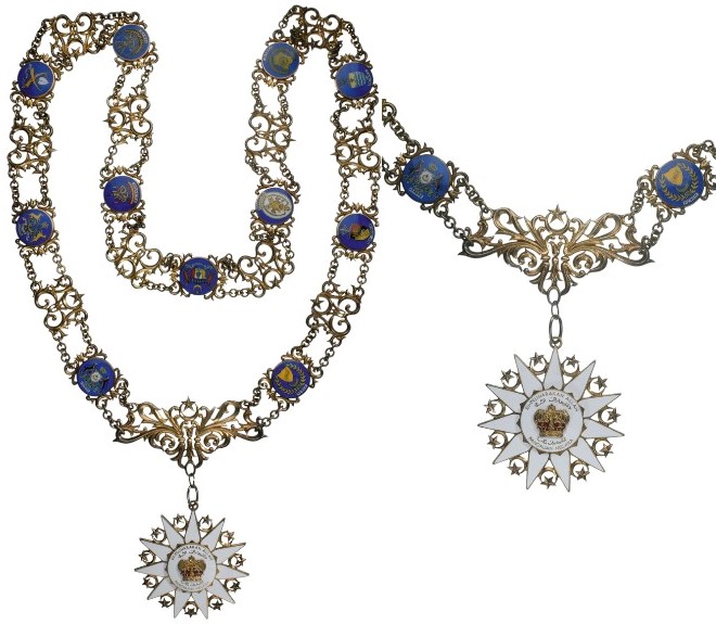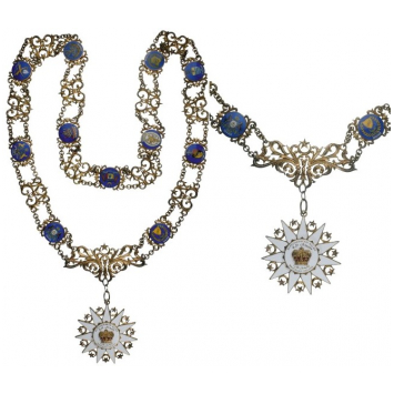 A Knight’s Grand Commander’s Collar of the Order (or “Seri Maharaja Mangku Negara”- “SMN”): gilt Silver chain, composed of 11 round, blue enameled medallions bearing the coat of arms of the various regions forming the state, done in finest enamel miniature, mounted within elaborate, ornamental pattern; 10 decorative links surmounted by the crescent and star, all connected by short elements of chain made of round rings and a larger, breast ornament, also surmounted by the crescent and star to which the gilt Silver Order’s Badge is appended, as a white enameled 11-pointed star flanked by crescents with star; white enameled centre medallion with separately- made and applied Royal Malaysian crown with enameled details and around, the Order’s motto written either in Arabic calligraphy and European characters.