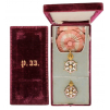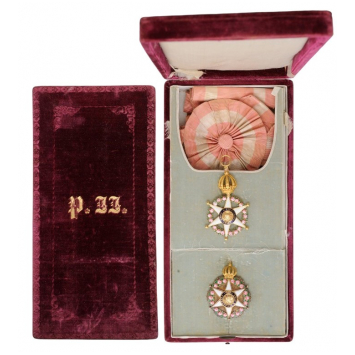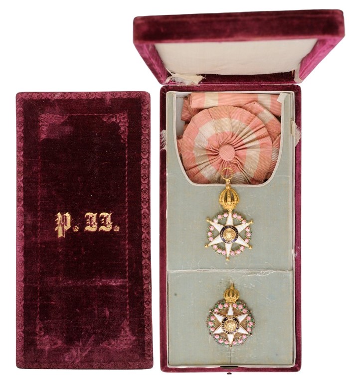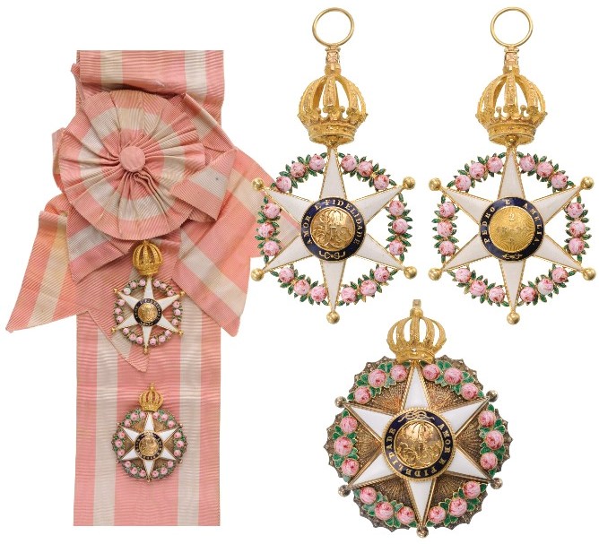 A complete Grand Cross set of the Order; Sash Badge in Gold with white enameled points with ball- finials, flanked by groups of three polychrome enameled roses, resting on green enameled leaves; centre medallion of polished gold with applied, chiseled Imperial monogram, within blue enameled outer circlet bearing the golden inscription “AMOR E FIDELIDADE” and a stylized bow; reverse centre medallion also in gold, but chiseled with a “beaming” pattern, bearing the date of foundation of the Order in gold numerals, within blue enameled outer circlet bearing the names of the Imperial couple “PEDRO E AMELIA” and a bow, similarly to the obverse; upper, hinged Imperial crown with finely chiseled details, round suspension ring and original, silk sash with cockade and button; Breast Star in Gold with the enameled order’s badge resting on a round base chiseled with a beaming pattern, the tips, slightly protruding off the enameled “roses”, the upper point with the Brazilian Imperial crown, also with chiseled details; polished reverse, with golden, vertical pin; the whole in the original, bordeaux-red velvet case, with pearl-white, fitted inner compartment, the lid, with gold embossed Imperial monogram “P.II.”.