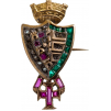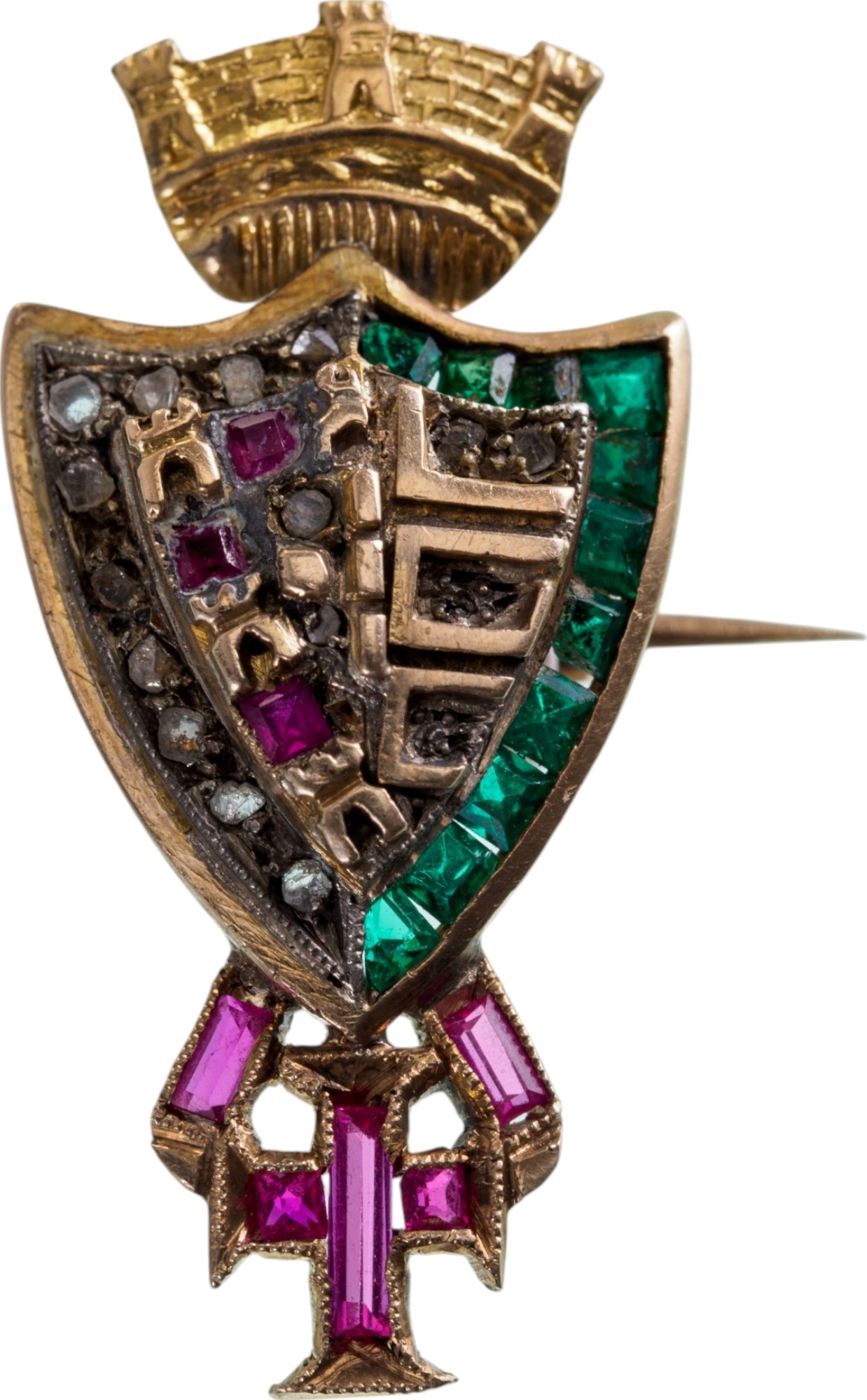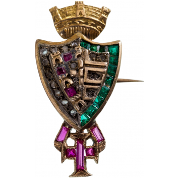 In Gold, as a shield bordered with emeralds, the field with golden towers and rubies to the left and horizontal bars to the right; below, the cross of the Supreme Order of Christ sided by stylized ribands, set with rubies; the reverse, fitted with horizontal pin.