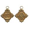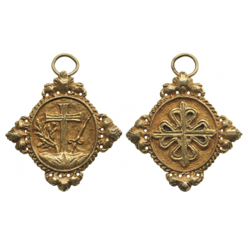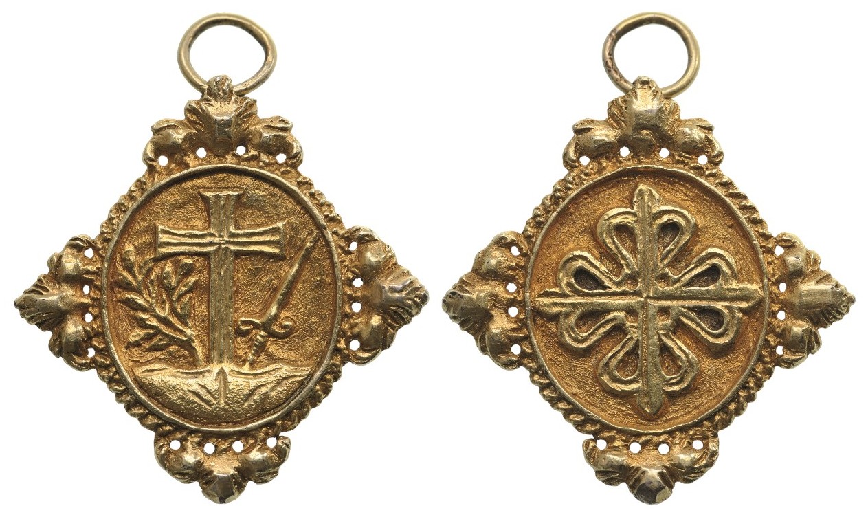 In the form of an ornated quatrefoil in Gold; the obverse with cross of the Dominican Order, the reverse, with the symbols of the Holy Inquisition, the Cross and an olive branch and the sword at its sides; ornamented, upper loop, with round ring.