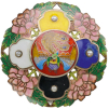 Gilt Silver, with 4 pink enameled roses sided by green leaves, with overlying “cross”, the arms enameled in yellow, blue, black and white resp. and centered by a pearl each; fire-red enameled centre medallion with polychrome enameled mythological bird; concave reverse, with vertical, tapering pin. A very rare decoration awarded to ladies only, excellent condition.